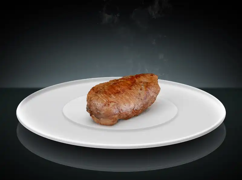 Das fein zugeschnittene Lieblingsstück vom Huhn. Schon im Anschnitt gleitet das Messer durch das zarte, wunderbar weiße und feinporige Fleisch. Der erste Biss offenbart die gesamte Lieblichkeit der vorgegarten Hähnchenbrust: Zart-saftig und doch so elastisch im Biss, wie es sein soll.