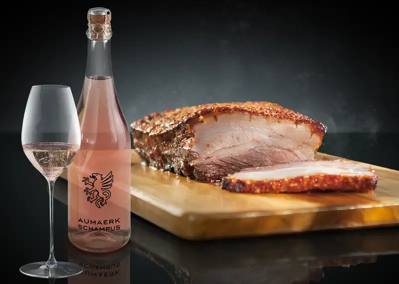 Die Kombination aus Schweinebraten und Schaumwein mag erst mal etwas unkonventionell erscheinen, doch sorgt gerade die Frische und Fruchtigkeit des *Schampus „ROSÉ“ zum herzhaften Geschmack des „Pork Royal“ für ein ungemein spannendes, außergewöhnliches Genusserlebnis. Die zarte Säure und der fein prickelnde Mousseux des Schampus schaffen ein erfrischendes Gegengewicht zum kräftigen Aroma des fetthaltigen Schweinebauches. Sie werden staunen, wie gut die beiden harmonieren!