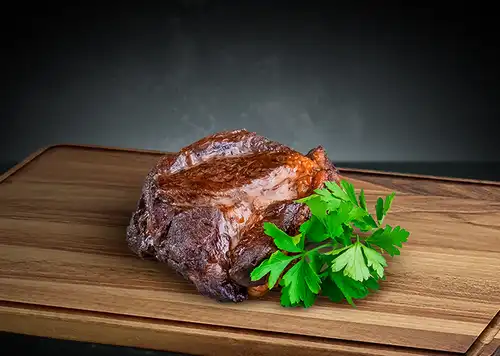 1. Den Special Cut vom Rinderrücken Beef Royal in der Vakuumverpackung für 5-10 Minuten im Spülbecken in warmes Wasser aus der Leitung legen. Beutel aufschneiden, Fleisch herausnehmen, Flüssigkeit in den Abfluss leeren und das Fleisch mit Küchenrolle trockenwischen.