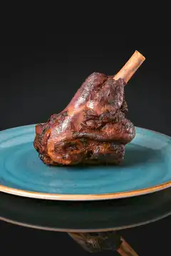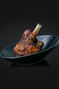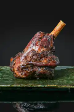 Das fertig gegarte Fleisch löst sich wie von selbst vom Knochen. Zart, saftig und butterweich offenbart dieses Edelstück eine perfekte Mischung aus Fleisch und Bindegewebe samt feiner Fetteinschlüsse, die der Lammstelze ihre unvergeichliche Charakteristik verleiht.