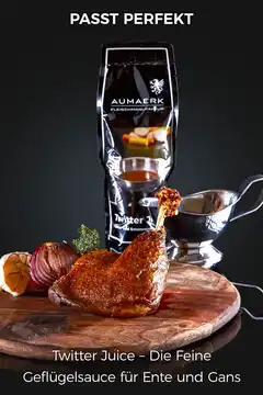 Nicht vergessen: Sauce zu Geflügel „Twitter Juice“ (350ml pro Stück) gleich im Warenkorb Ihrer Bestellung hinzufügen, zu Hause nur 5 Minuten aufköcheln und zu Gans & Ente genießen.