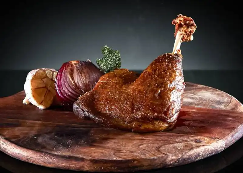 Der Haut sieht man den optimalen Knusperfaktor auf den ersten Blick an. Es knackt richtiggehend beim Anschnitt, danach gleitet das Messer wie von Zauberhand geführt durch das zart-saftige Fleisch, das sich wie von selbst vom Knochen lösen lässt.