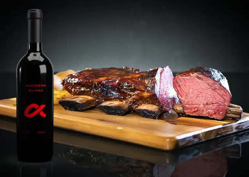 Ein besonders eleganter Begleiter zum exquisiten dunklen Fleisch der einzigartig zart vorgegarten Rinderrippe „Big Beef Rib“ ist der Rotwein „ALPHA“. Mit dunklen Waldbeer-Aromen und feinen Noten von Gewürznelken harmoniert der aus den Sorten Blaufränkisch, Zweigelt und Merlot cuveetierte Wein ausgezeichnet zum vollen unverfälschten Rindfleischgeschmack der fein marmorierten, unvergleichlich saftigen Short Ribs.